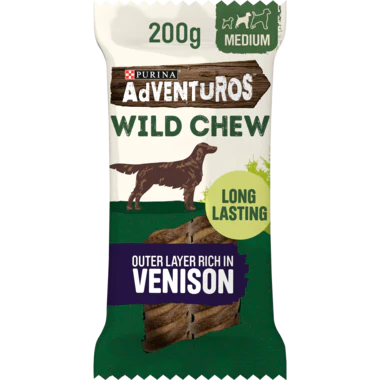 Give your dog something that appeals to their natural instincts of biting, playing and chewing! Purina Adventuros has created Wild Chew, a long-lasting chew wrapped in a delicious, tender layer rich in Venison. Your dog will love to bite into the tasty outer and discover the chewy innera| just like they would do naturally in the wild!