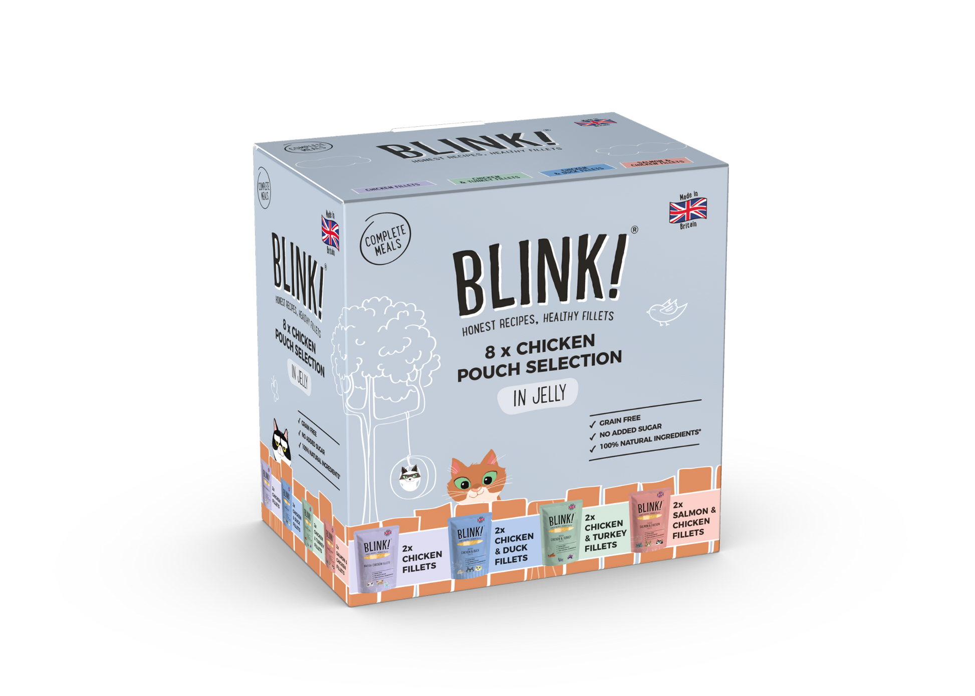We love that a cats slow blink is a sign at trust. So we though, hey. If cats trust us to care for them and feed them, what would they want us to buy them on the weekly food shop? That's why they've created nutritious, complete recipes full of real meat and fish, with nothing your cat wouldn't want to eat, like cereals, grains and sugars. It's simple really: great recipes + real meat & fish + some crazy cats = Blink! Grain free No added salt or sugar Made with natural ingredients* with added vitamins & minerals Box Contents: 2x Chicken and Duck Fillets 2x Chicken and Turkey Fillets 2x Chicken Fillets 2x Salmon and Chicken Fillets. Complete food for Cats 1yr+.